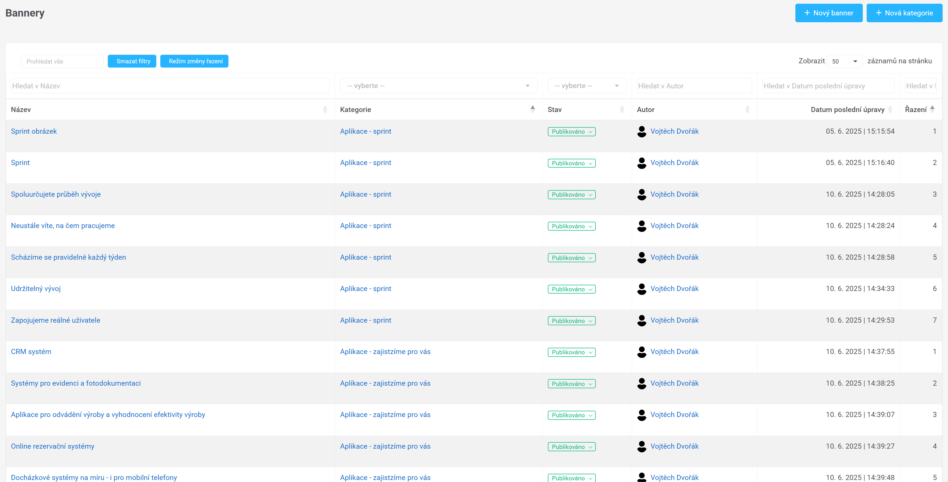 Správa grafických bannerů (prvků) je tvořena stromovou strukturou obdobně jako články. I když se jedná pouze o 1 banner (např. CTA prvek), musí mít vytvořenou kategorii.